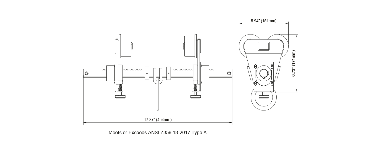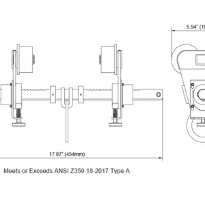 Fabricado en aleación de aluminio y acero inoxidable, ofrece una combinación óptima de resistencia, durabilidad y peso reducido. Este anclaje móvil cumple con los más exigentes estándares de seguridad, incluyendo ANSI Z359.18-2017 Tipo A, garantizando un desempeño confiable en sistemas de detención de caídas.